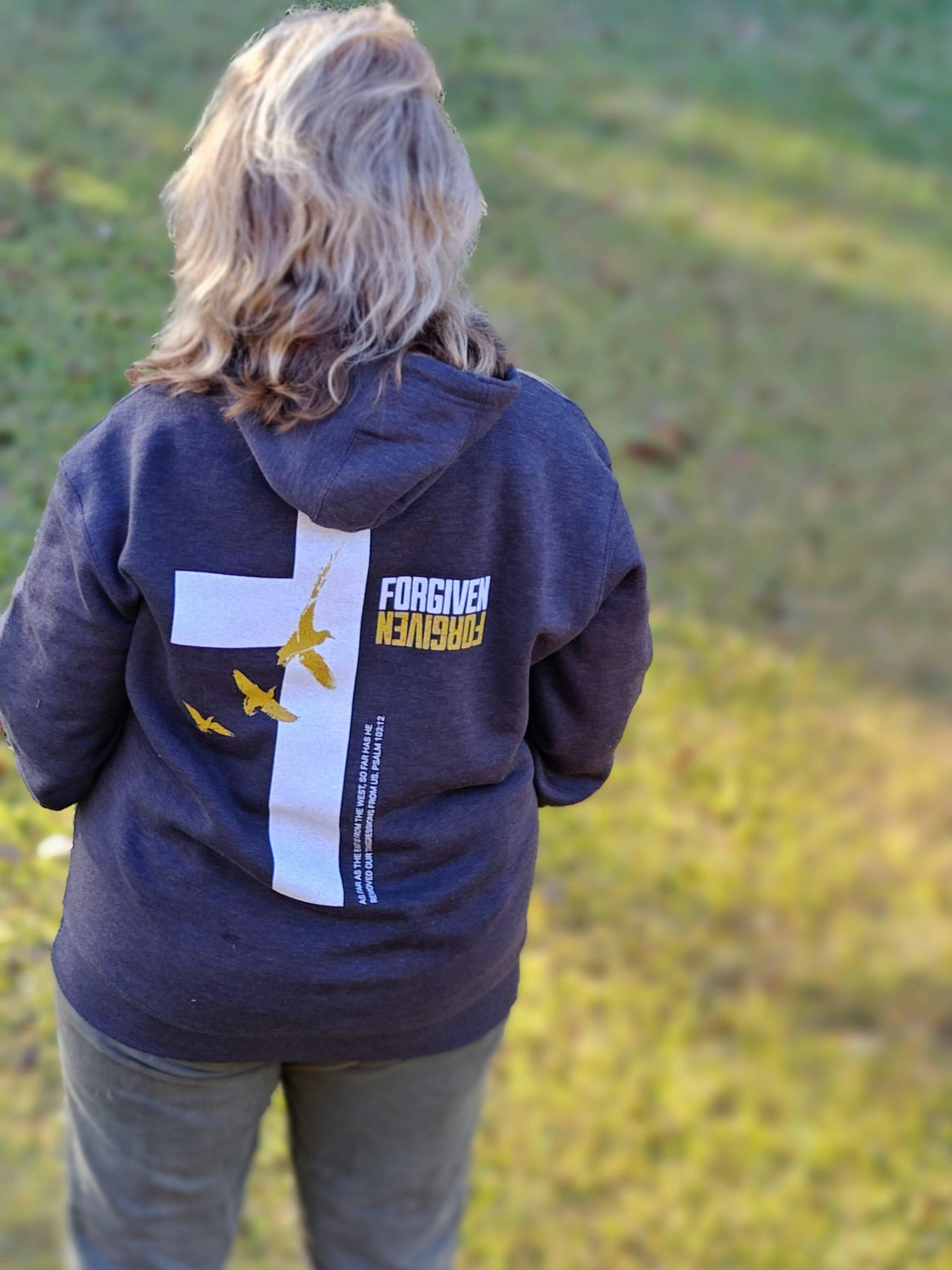 • DTG-printed Forgiven graphic with Psalm 103:12 reference