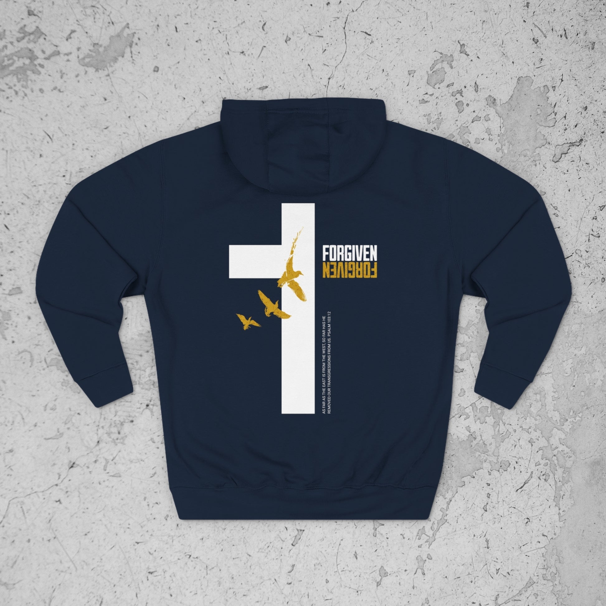 The Forgiven Hoodie (Psalm 103:12) is built on redemption, grace, and the liberating power of God’s mercy — “as far as the east is from the west” is how completely He removes our sin. This piece is a bold reminder that forgiveness in Christ is final, full, and forever.